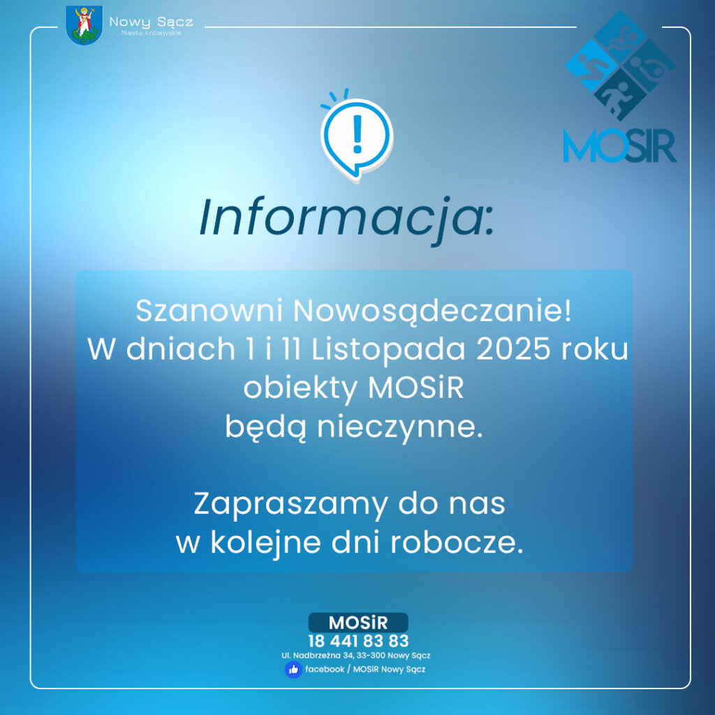 Czytaj dalej...Szanowni nowosądeczaninie! W dniach 1 i 11 Listopada 2025 roku obiekty MOSiR będą nieczynne. Zapraszamy do nas w kolejne dni...